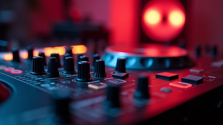 Close-up de mesa de mixagem com equipamentos de DJ em estúdio